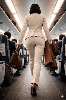通勤列車の車内を歩く妻。ほかの通勤客の目を引いていました。